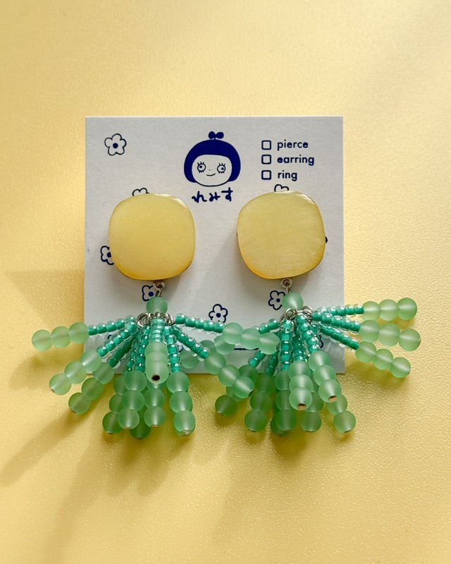 【昭和のレトロボタンを使ったポップなアクセサリー】 こちらの商品はピアスです。金具の変更はできません。 フレッシュな色合いが目を引く、左右アシンメトリーデザインの耳飾り。 まろやかな光沢のあるイエローとミントグリーンのレトロボタンを使用し、つややかな質感が上品な華やかさを演出します。 それぞれの耳元には、しずく型のビーズや透明感のあるパーツをふんだんに組み合わせ、軽やかさを感じさせる仕上がりに。動きに合わせて揺れるビーズが、顔まわりにさりげない存在感を与えてくれます。 春夏のお出かけや、ワンピースに合わせて特別感を添えたいときに。 サイズ:縦80約mm 横約25mm ーーーーーーーーーーーー れみす – ヨソユキ – ちょっと特別な日。 ほんの少し背筋が伸びるような日。 そんな日のための、とっておきのアクセサリーができました。 ヨソユキコレクションは、 上質なボタンやビーズを使って仕立てた、 いつものれみすとはひと味ちがうライン。 左右非対称や印象的なフォルムなど、 デザインに“さりげない個性”を忍ばせました。 パッケージも、ヨソユキだけの特別仕様でお届けします。 いつもとは違う箱と台紙に、 「自分に贈るプレゼント」としての想いを込めてお包みします。 ーーーーーーーーーーーー ・ピアスの金具はチタン、イヤリングは真鍮の素材を使用しています。 ・新品のボタンを使用していますが、昔のものです。こちらでも検品は行っていますが経年による変化がボタンに見られる場合がございます。そちらもお楽しみいただけますと幸いです。 ・何十年も昔から眠っていたボタンたちが新しくアクセサリーとなり、あなたの元で長く使っていただけたら嬉しいです。
