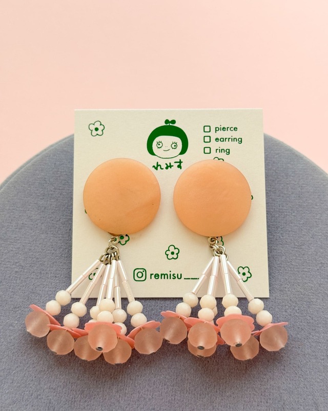 【昭和のレトロボタンを使ったポップなアクセサリー】 こちらの商品はピアスです。金具の変更はできません。 柔らかなピーチカラーのレトロボタンをトップに使用した、どこか懐かしい雰囲気のアクセサリー。ミルキーピンクのビーズと、お花のスパンコールを組み合わせた、立体的なデザインです。 サイズ:縦60約mm 横約23mm ・ピアスの金具はチタン、イヤリングは真鍮の素材を使用しています。 ・新品のボタンを使用していますが、昔のものです。こちらでも検品は行っていますが経年による変化がボタンに見られる場合がございます。そちらもお楽しみいただけますと幸いです。 ・何十年も昔から眠っていたボタンたちが新しくアクセサリーとなり、あなたの元で長く使っていただけたら嬉しいです。
