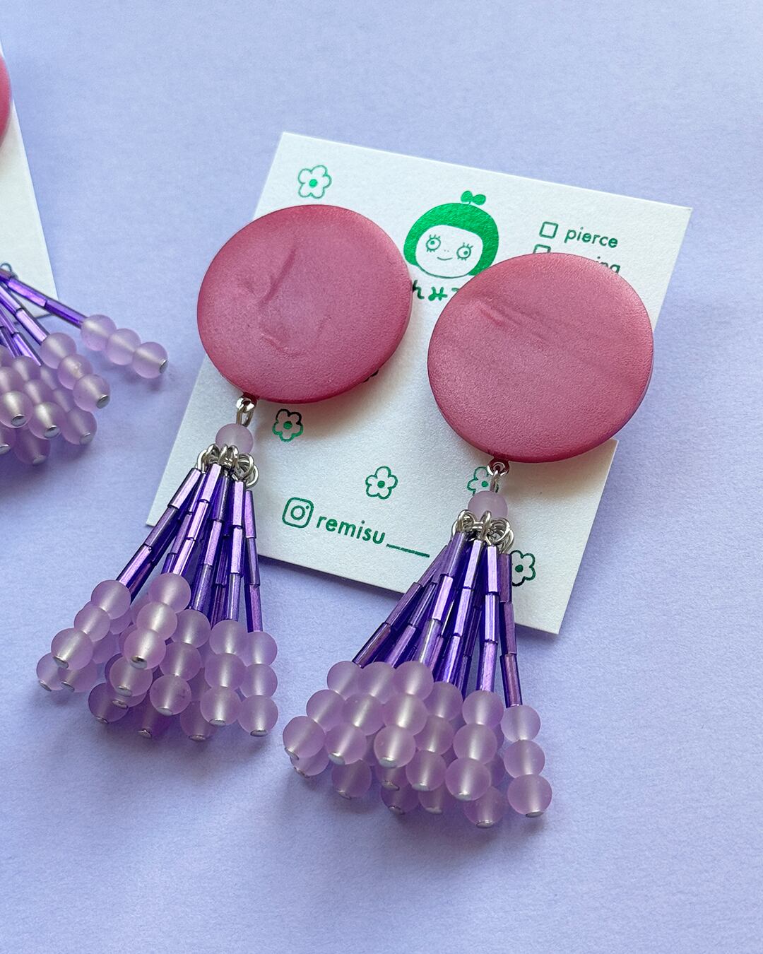 鮮やかな紫のボタンと、ビーズでまとめた耳飾り。存在感のある大きめサイズがコーデのアクセントにぴったりです。光の角度によってほんのり透けるビーズが、揺れるたびに表情を変えてくれます。カラフルでちょっぴり個性的な耳飾りをお探しの方に。