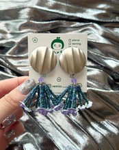 シルバーの大ぶりボタンに、紫やブルーのビーズを合わせた耳飾り。