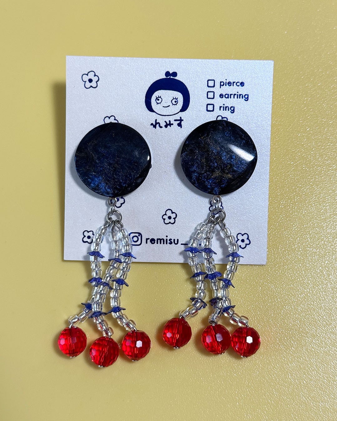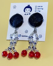 深みのあるネイビーのボタンに、透明感のあるビーズを合わせた個性的なデザインの耳飾り。
