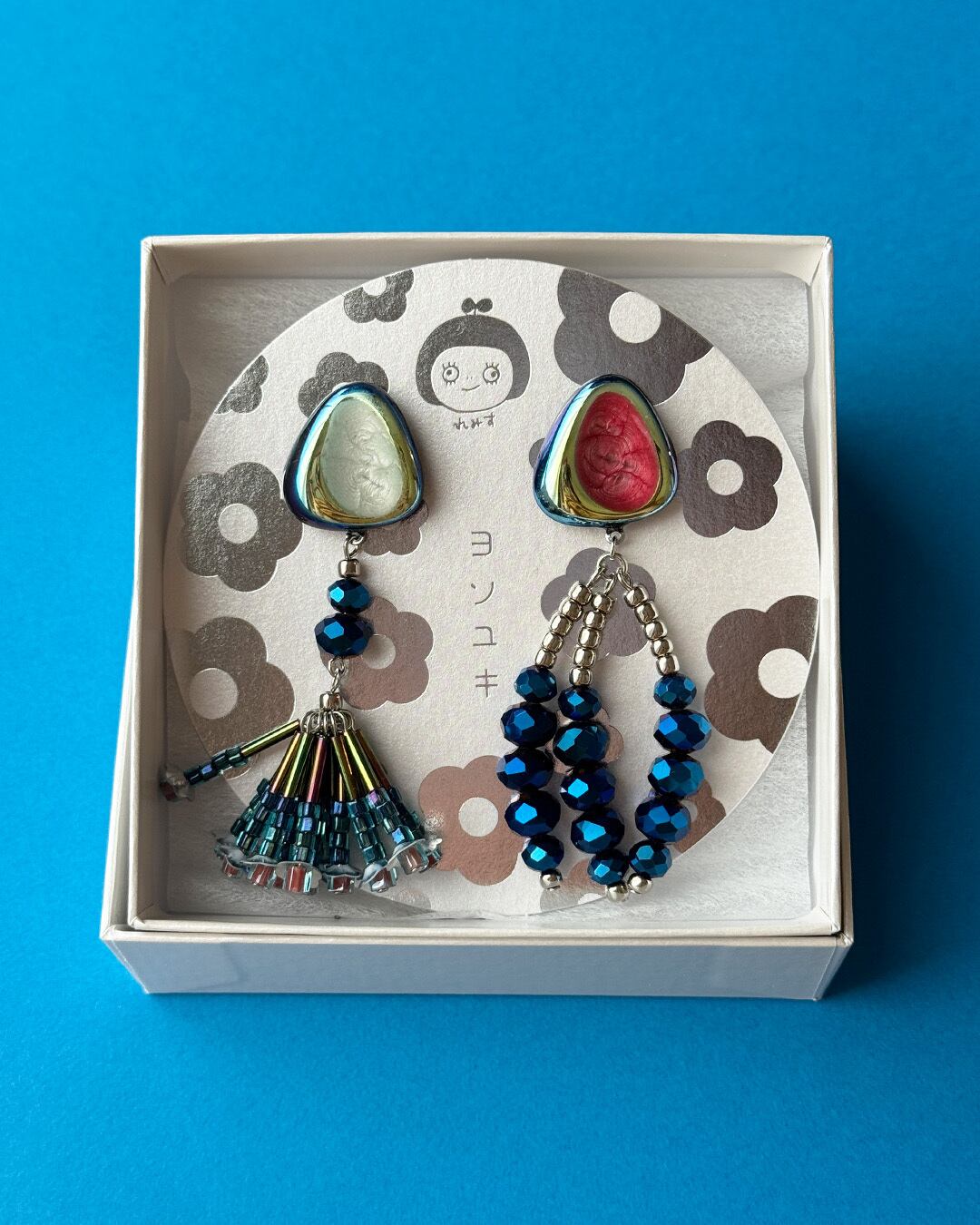 青のグラデーションが印象的な、左右アシンメトリーの耳飾り。