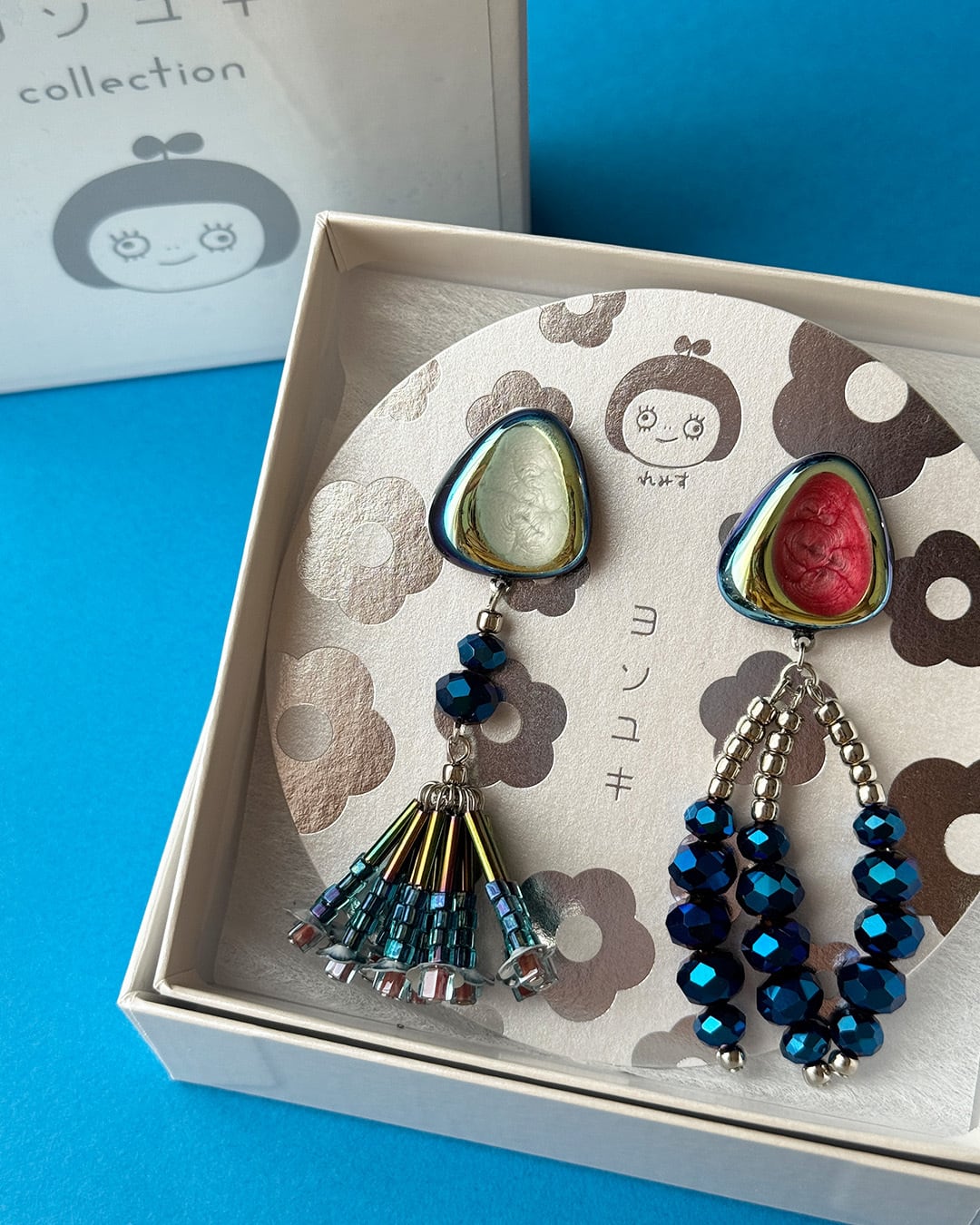 青のグラデーションが印象的な、左右アシンメトリーの耳飾り。