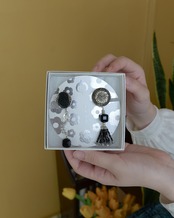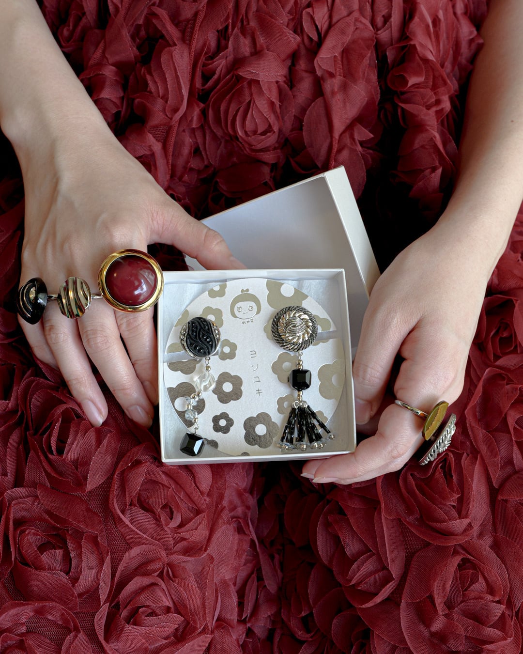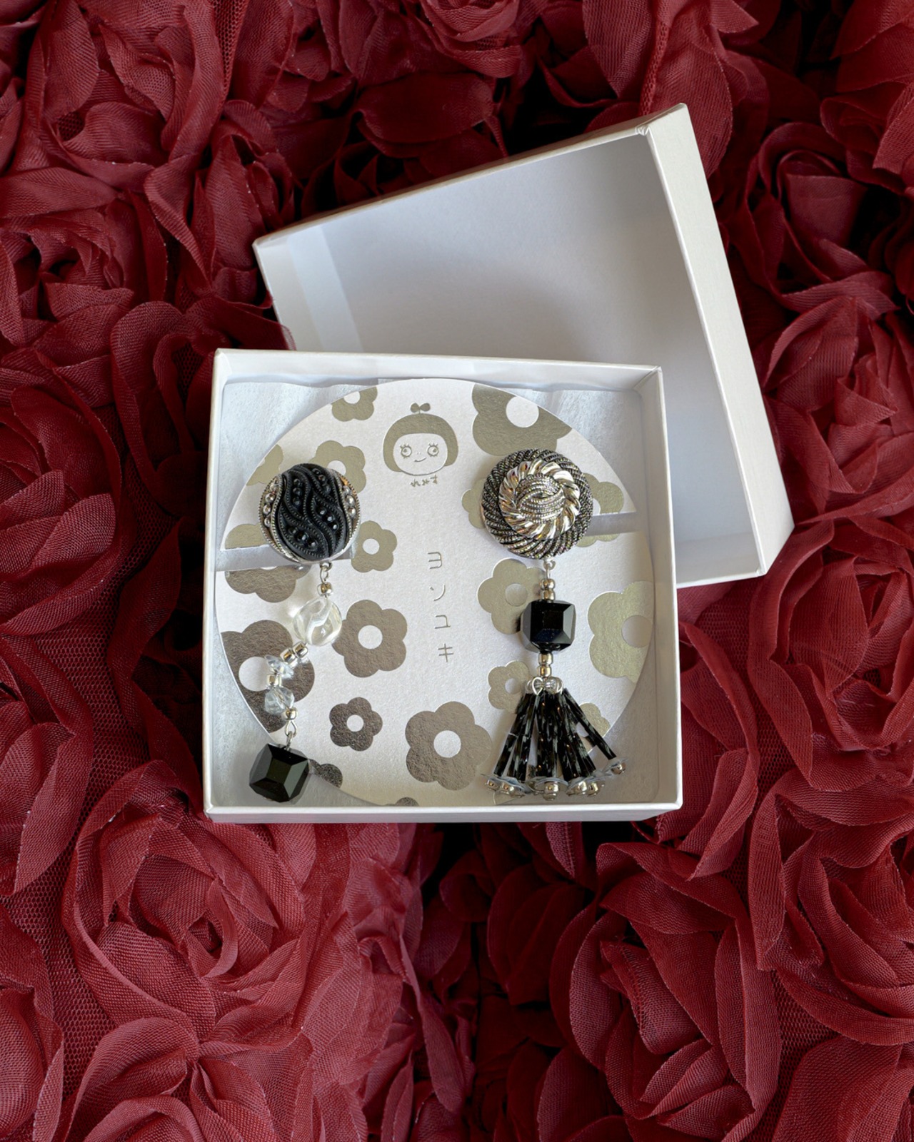 立体的な彫り模様が美しいブラックと、重厚感のあるシルバーのレトロボタンを使用。奥行きのある光沢が、耳元に品格を添えます。