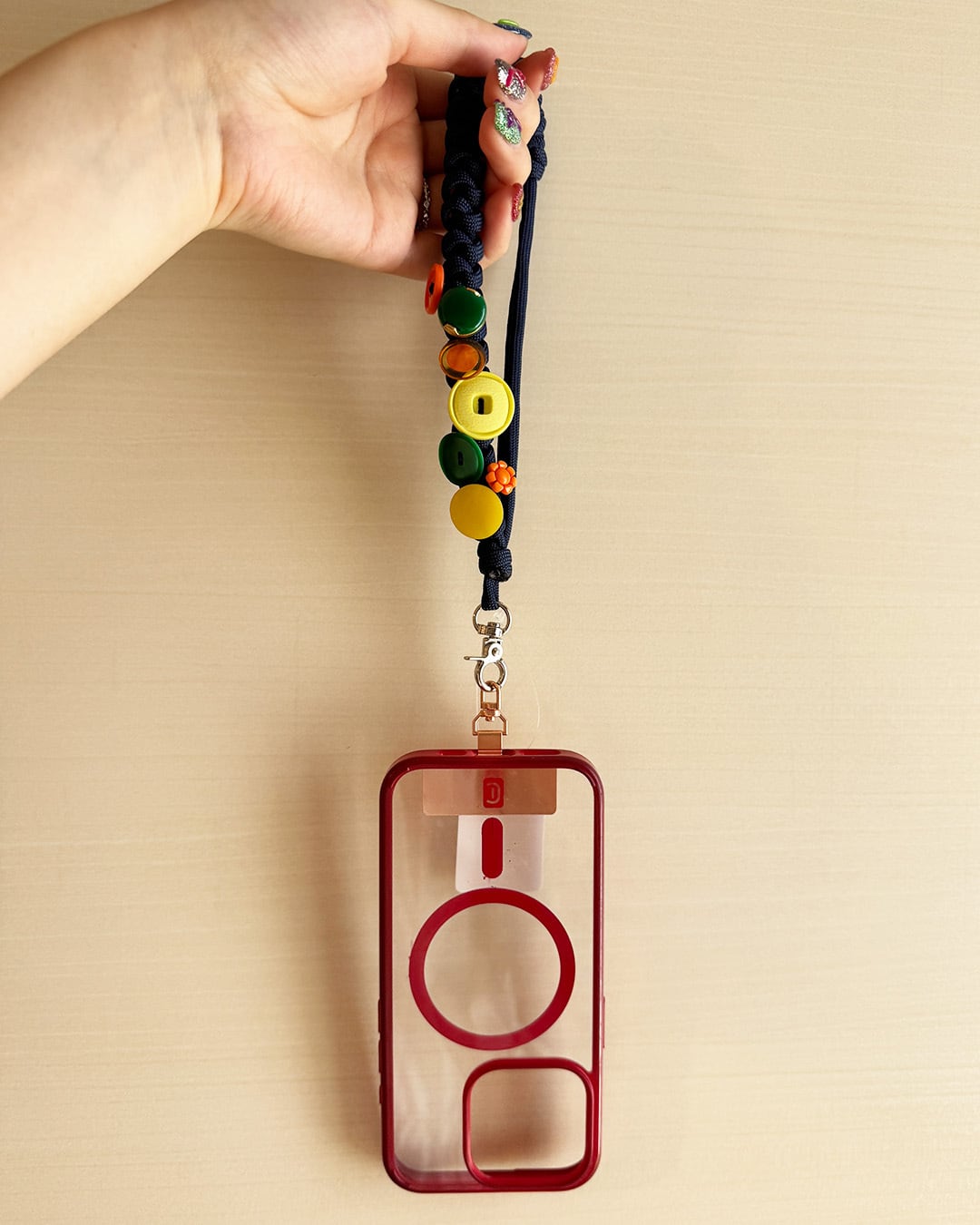 カラフルで存在感のあるパラコード部分はオオツカさんが手がけ、ボタン飾りはれみすが担当。お互いの「好き」と「こだわり」をぎゅっと詰め込んだ、共同制作ならではの一点です。