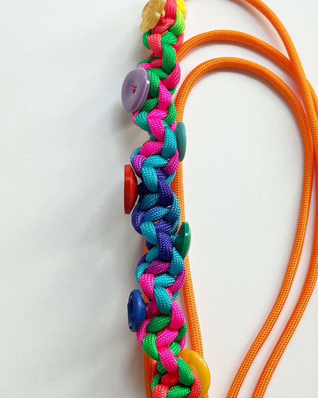 カラフルで存在感のあるパラコード部分はオオツカさんが手がけ、ボタン飾りはれみすが担当。お互いの「好き」と「こだわり」をぎゅっと詰め込んだ、共同制作ならではの一点です。