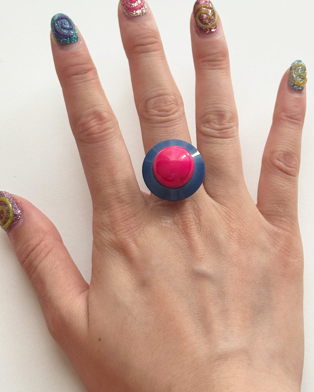 ブルーのボタンにピンクのぷくりとしたボタンを合わせたゆびわです。