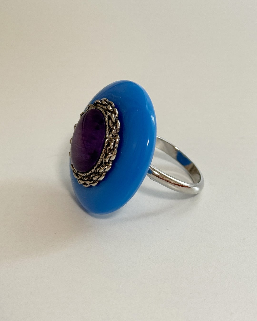 ブルーのボタンに紫のボタンを合わせたゆびわです。