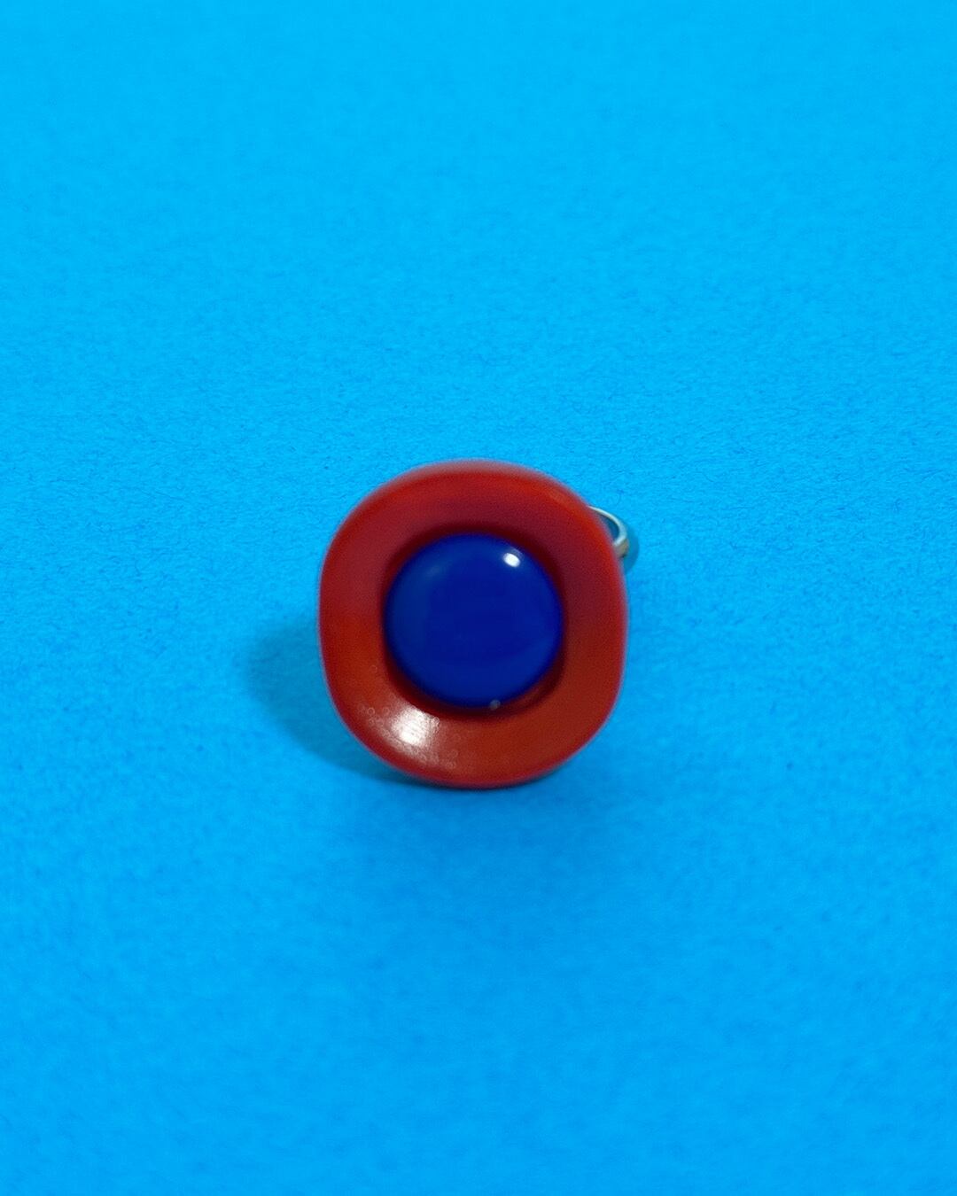 赤と青、ふたつのボタンを重ねたゆびわ。