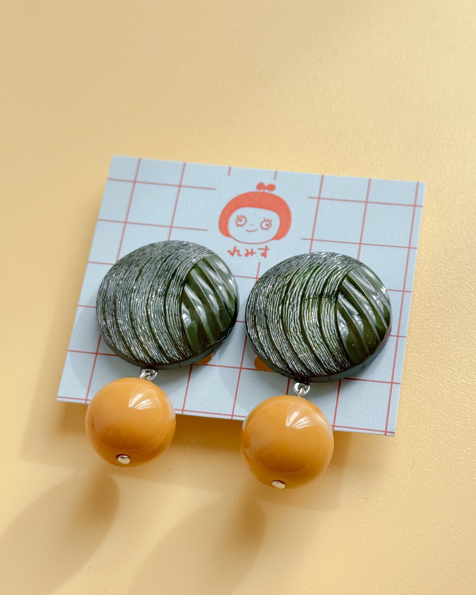 深緑のレトロボタンと、からし色の丸いビーズを組み合わせた、ころんとした耳飾りです。
