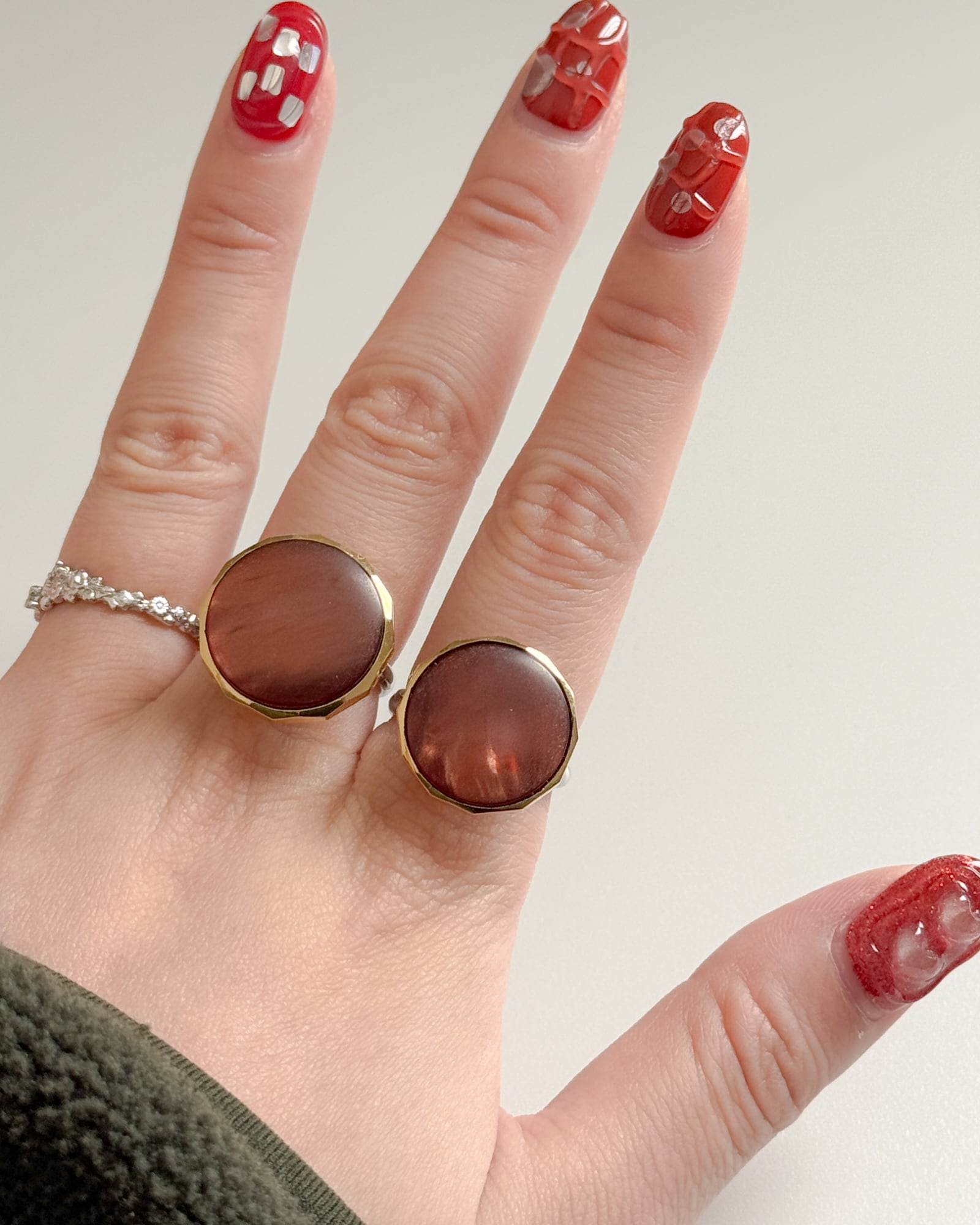 光に当たると茶色いボタンがオレンジに見えたり、赤っぽく見える綺麗なボタンを使ったゆびわです。サイズが少し異なりますので、お選びください。