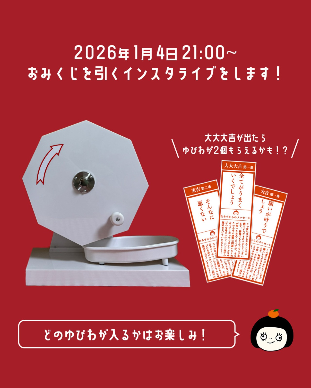 ・おみくじは福引きの機械を回して行います。おみくじを引く様子は2026年1月4日21時からインスタライブで配信予定です。
